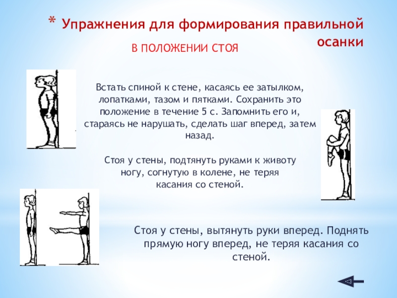 Стоя у стены, вытянуть руки вперед. Поднять прямую ногу вперед, не теряя касания со стеной.