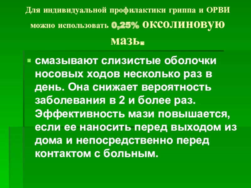 смазывают слизистые оболочки носовых ходов несколько раз в день. Она снижает вероятность заболевания в 2 и более раз. Эффективность мази повышается, если ее наносить перед выходом из дома и непосредственно перед контактом с больным.