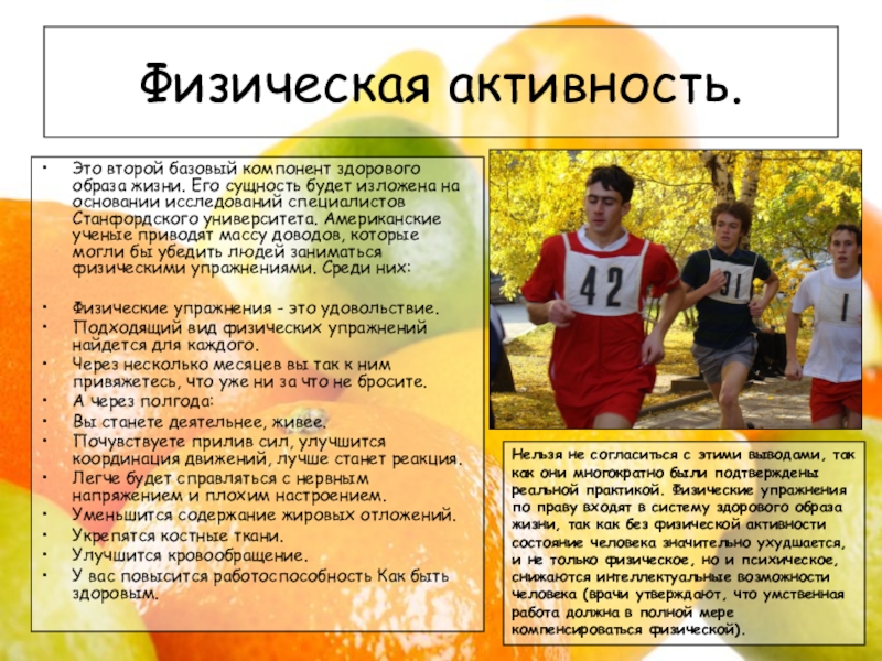 Нельзя не согласиться с этими выводами, так как они многократно были подтверждены реальной практикой. Физические упражнения по праву входят в систему здорового образа жизни, так как без физической активности состояние человека значительно ухудшается, и не только физическое, но и психическое, снижаются интеллектуальные возможности человека (врачи утверждают, что умственная работа должна в полной мере компенсироваться физической).