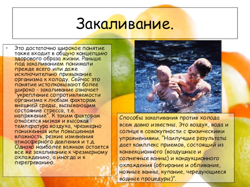 Способы закаливания против холода всем давно известны. Это воздух, вода и солнце в совокупности с физическими упражнениями. “Наилучшие результаты дает комплекс приемов, состоящий из конвекционного (воздушные и солнечные ванны) и кондукционного охлаждения (обтирание и обливание, ножные ванны, купание, чередующиеся водные процедуры)”.