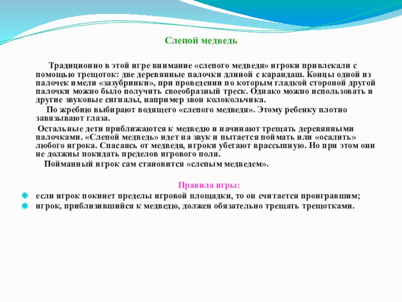 Остальные дети приближаются к медведю и начинают трещать деревянными палочками. «Слепой медведь» идет на звук и пытается поймать или «осалить» любого игрока. Спасаясь от медведя, игроки убегают врассыпную. Но при этом они не должны покидать пределов игрового поля.