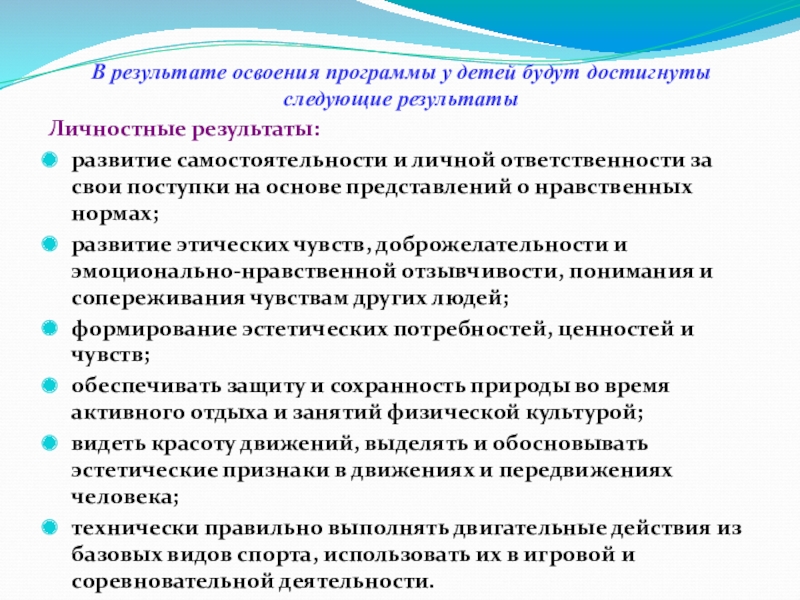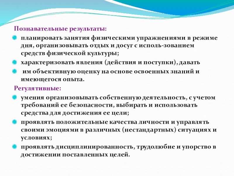при выполнении учебных заданий, отбор способов их исправления; анализ и объективная оценка результатов собственного труда, поиск возможностей и способов их улучшения; видение красоты движений, выделение и обоснование эстетических признаков в движениях и передвижениях человека; управление эмоциями; технически правильное выполнение двигательных действий.