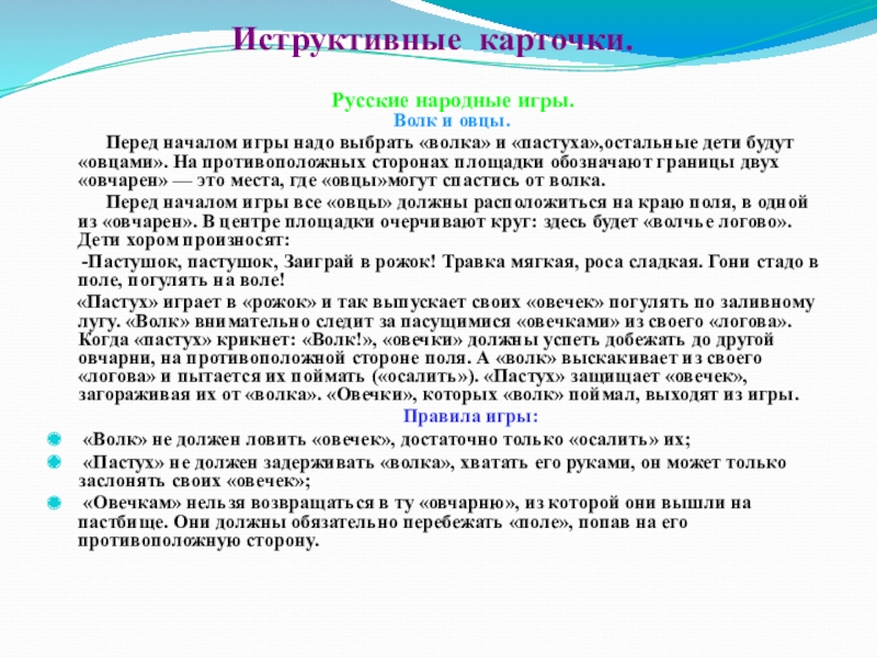 Перед началом игры надо выбрать «волка» и «пастуха»,остальные дети будут «овцами». На противоположных сторонах площадки обозначают границы двух «овчарен» — это места, где «овцы»могут спастись от волка.