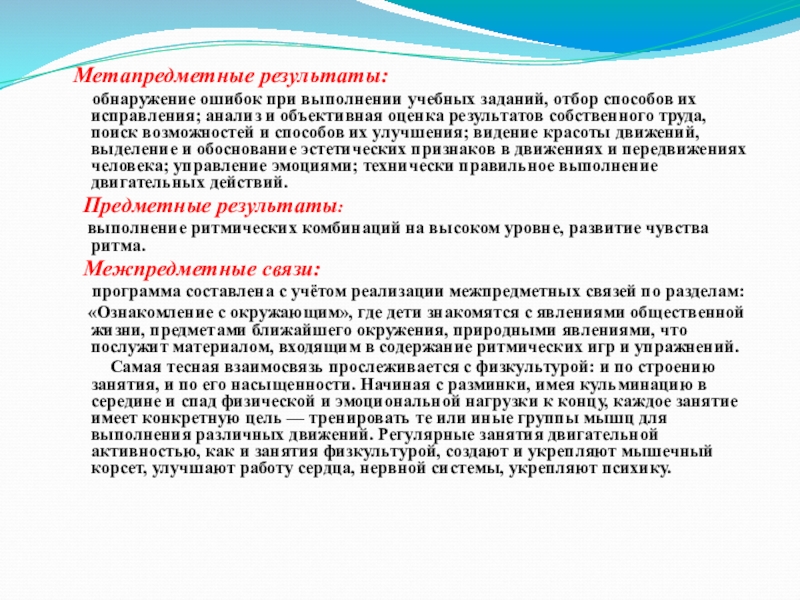 «Ознакомление с окружающим», где дети знакомятся с явлениями общественной жизни, предметами ближайшего окружения, природными явлениями, что послужит материалом, входящим в содержание ритмических игр и упражнений.