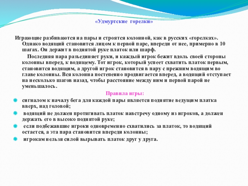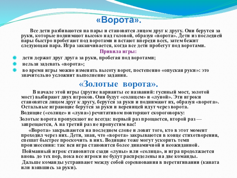 и становятся лицом друг к другу. Они берутся за руки, которые поднимают высоко над головой, образуя «ворота». Дети из последней пары быстро пробегают под воротами и встают впереди всех, затем бежит следующая пара. Игра заканчивается, когда все дети пробегут под воротами.