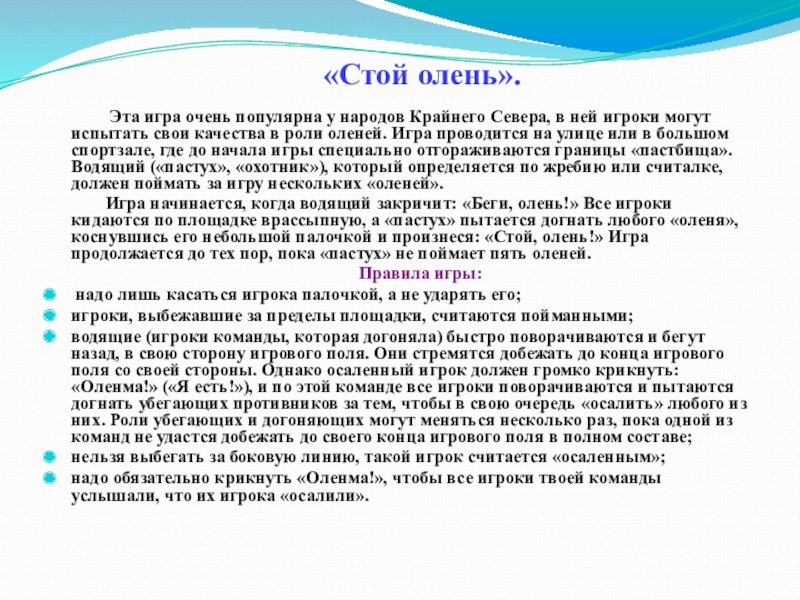 Игра начинается, когда водящий закричит: «Беги, олень!» Все игроки кидаются по площадке врассыпную, а «пастух» пытается догнать любого «оленя», коснувшись его небольшой палочкой и произнеся: «Стой, олень!» Игра продолжается до тех пор, пока «пастух» не поймает пять оленей.