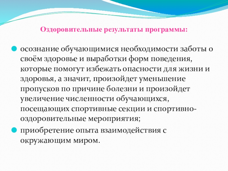форм поведения, которые помогут избежать опасности для жизни и здоровья, а значит, произойдет уменьшение пропусков по причине болезни и произойдет увеличение численности обучающихся, посещающих спортивные секции и спортивно-оздоровительные мероприятия;