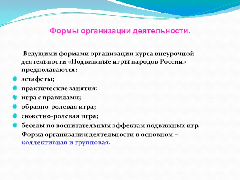 организации курса внеурочной деятельности «Подвижные игры народов России»предполагаются: