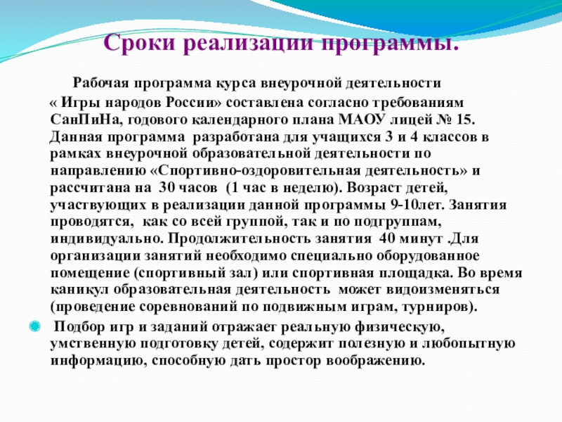 « Игры народов России» составлена согласно требованиям СанПиНа, годового календарного плана МАОУ лицей № 15. Данная программа разработана для учащихся 3 и 4 классов в рамках внеурочной образовательной деятельности по направлению «Спортивно-оздоровительная деятельность» и рассчитана на 30 часов (1 час в неделю). Возраст детей, участвующих в реализации данной программы 9-10лет. Занятия проводятся, как со всей группой, так и по подгруппам, индивидуально. Продолжительность занятия 40 минут .Для организации занятий необходимо специально оборудованное помещение (спортивный зал) или спортивная площадка. Во время каникул образовательная деятельность может видоизменяться (проведение соревнований по подвижным играм, турниров).