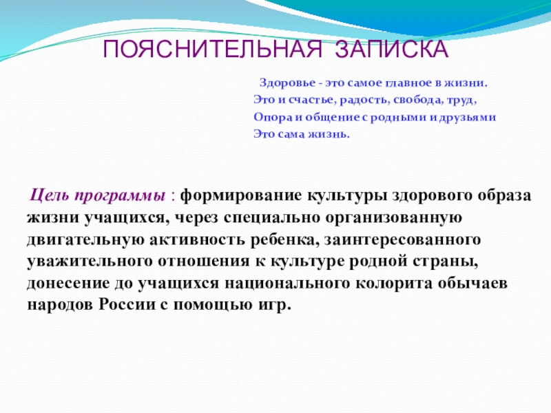 Цель программы : формирование культуры здорового образа жизни учащихся, через специально организованную двигательную активность ребенка, заинтересованного уважительного отношения к культуре родной страны, донесение до учащихся национального колорита обычаев народов России с помощью игр.