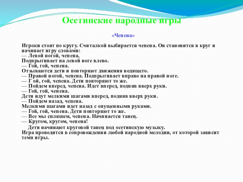 Игра проводится в сопровождении любой народной мелодии, от которой зависит темп игры.