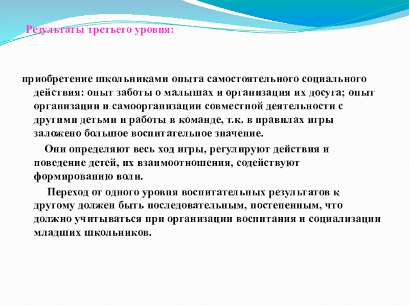 Переход от одного уровня воспитательных результатов к другому должен быть последовательным, постепенным, что должно учитываться при организации воспитания и социализации младших школьников.