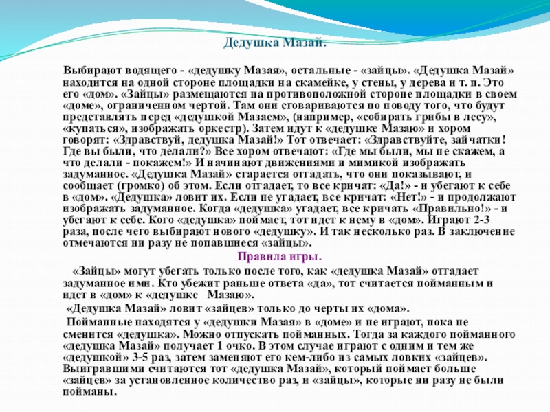 Выбирают водящего - «дедушку Мазая», остальные - «зайцы». «Дедушка Мазай» находится на одной стороне площадки на скамейке, у стены, у дерева и т. п. Это его «дом». «Зайцы» размещаются на противоположной стороне площадки в своем «доме», ограниченном чертой. Там они сговариваются по поводу того, что будут представлять перед «дедушкой Мазаем», (например, «собирать грибы в лесу», «купаться», изображать оркестр). Затем идут к «дедушке Мазаю» и хором говорят: «Здравствуй, дедушка Мазай!» Тот отвечает: «Здравствуйте, зайчатки! Где вы были, что делали?» Все хором отвечают: «Где мы были, мы не скажем, а что делали - покажем!» И начинают движениями и мимикой изображать задуманное. «Дедушка Мазай» старается отгадать, что они показывают, и сообщает (громко) об этом. Если отгадает, то все кричат: «Да!» - и убегают к себе в «дом». «Дедушка» ловит их. Если не угадает, все кричат: «Нет!» - и продолжают изображать задуманное. Когда «дедушка» угадает, все кричать «Правильно!» - и убегают к себе. Кого «дедушка» поймает, тот идет к нему в «дом». Играют 2-3 раза, после чего выбирают нового «дедушку». И так несколько раз. В заключение отмечаются ни разу не попавшиеся «зайцы».