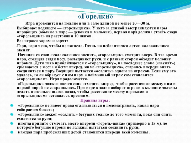 Выбирают водящего — «горелыцика». У него за спиной выстраиваются пары играющих (обычно в паре — девочка и мальчик), первая пара должна стоять сзади «горелыцика» на расстоянии 10 шагов.