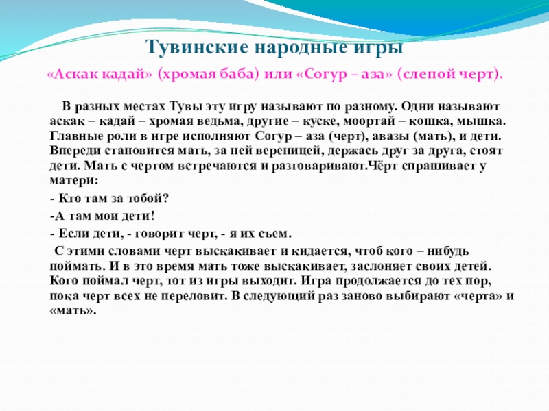 В разных местах Тувы эту игру называют по разному. Одни называют аскак – кадай – хромая ведьма, другие – куске, моортай – кошка, мышка. Главные роли в игре исполняют Согур – аза (черт), авазы (мать), и дети.Впереди становится мать, за ней вереницей, держась друг за друга, стоят дети. Мать с чертом встречаются и разговаривают.Чёрт спрашивает у матери:
