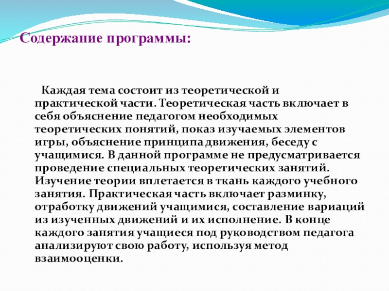 части. Теоретическая часть включает в себя объяснение педагогом необходимых теоретических понятий, показ изучаемых элементов игры, объяснение принципа движения, беседу с учащимися. В данной программе не предусматривается проведение специальных теоретических занятий. Изучение теории вплетается в ткань каждого учебного занятия. Практическая часть включает разминку, отработку движений учащимися, составление вариаций из изученных движений и их исполнение. В конце каждого занятия учащиеся под руководством педагога анализируют свою работу, используя метод взаимооценки.