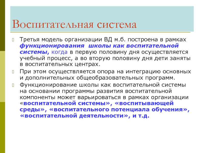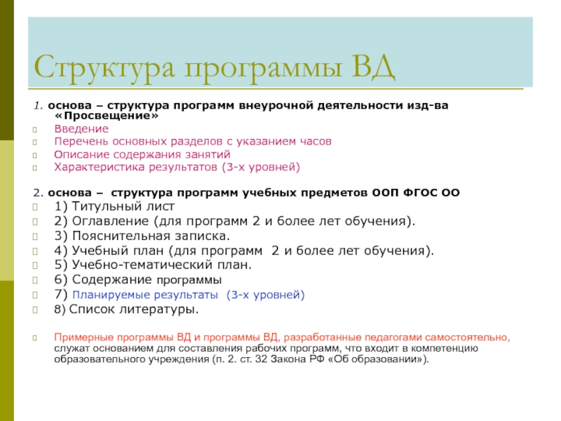 Примерные программы ВД и программы ВД, разработанные педагогами самостоятельно, служат основанием для составления рабочих программ, что входит в компетенцию образовательного учреждения (п. 2. ст. 32 Закона РФ «Об образовании»).