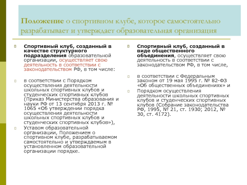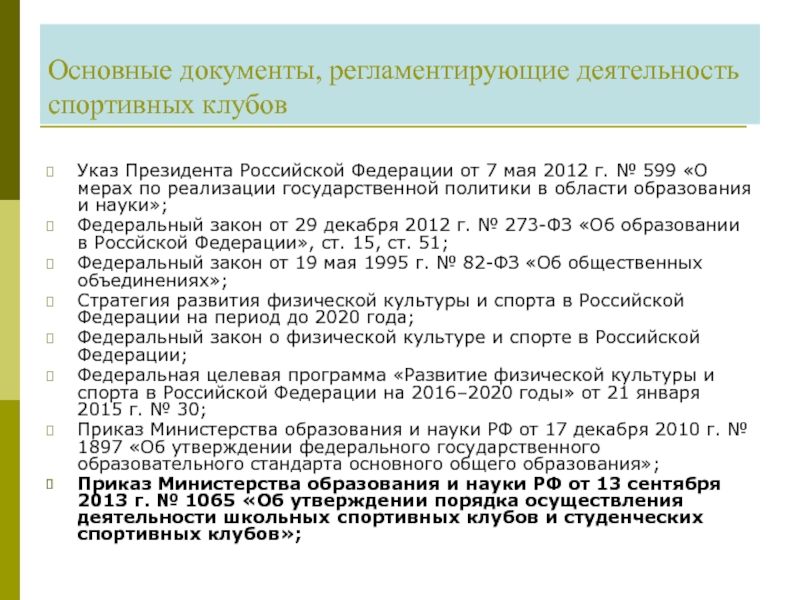 Приказ Министерства образования и науки РФ от 13 сентября 2013 г. № 1065 «Об утверждении порядка осуществления деятельности школьных спортивных клубов и студенческих спортивных клубов»;