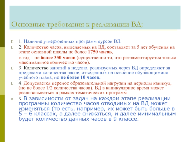 часов, выделяемых на ВД, составляет за 5 лет обучения на этапе основной школы не более 1750 часов,
