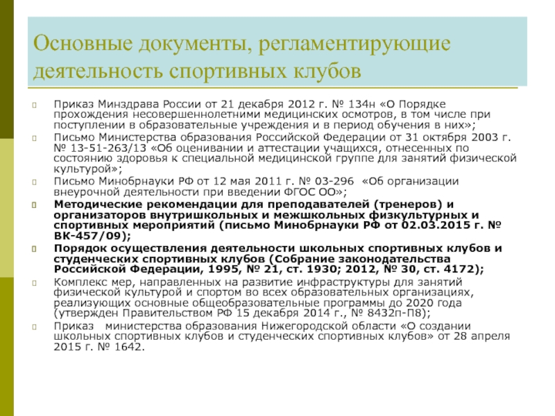 Приказ министерства образования Нижегородской области «О создании школьных спортивных клубов и студенческих спортивных клубов» от 28 апреля 2015 г. № 1642.