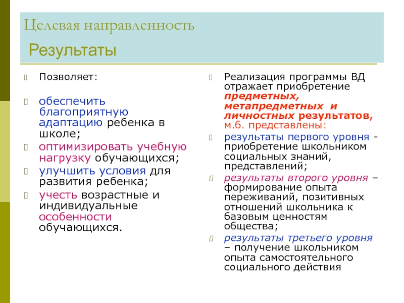 Реализация программы ВД отражает приобретение предметных, метапредметных и личностных результатов, м.б. представлены: