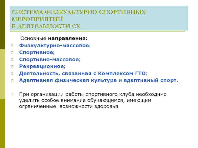 При организации работы спортивного клуба необходимо уделить особое внимание обучающимся, имеющим ограниченные возможности здоровья