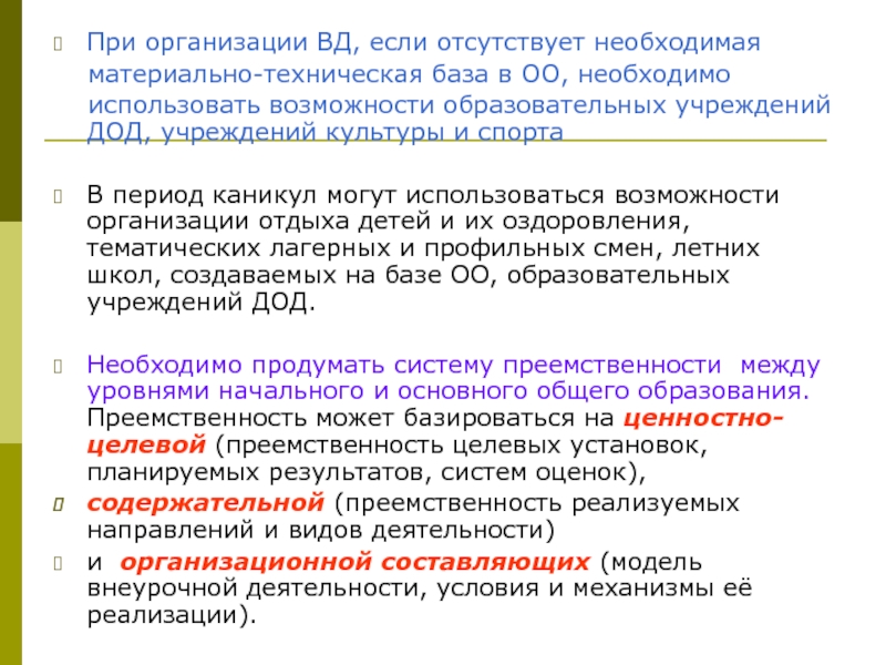 В период каникул могут использоваться возможности организации отдыха детей и их оздоровления, тематических лагерных и профильных смен, летних школ, создаваемых на базе ОО, образовательных учреждений ДОД.