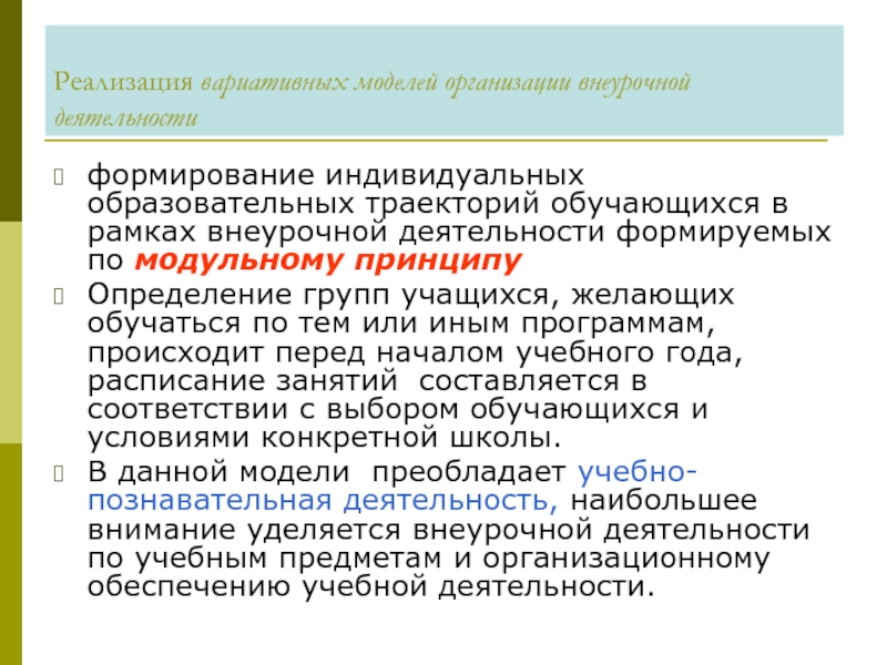 обучающихся за рамками урока; является основной структурной единицей программно-методического сопровождения определённой модели организации внеурочной деятельности