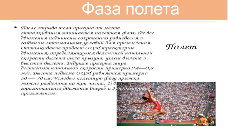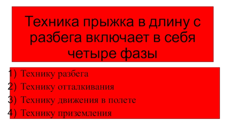Техника прыжка в длину с разбега включает в себя четыре фазыТехнику разбегаТехнику отталкиванияТехнику движения в полете Технику