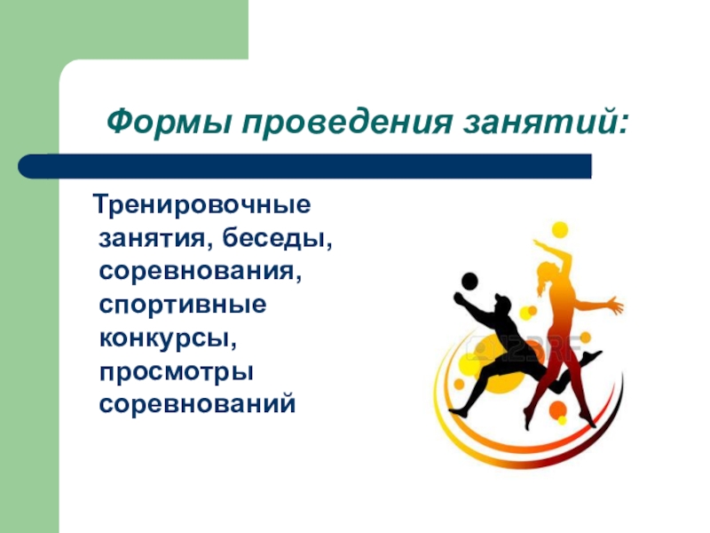 Тренировочные занятия, беседы, соревнования, спортивные конкурсы, просмотры