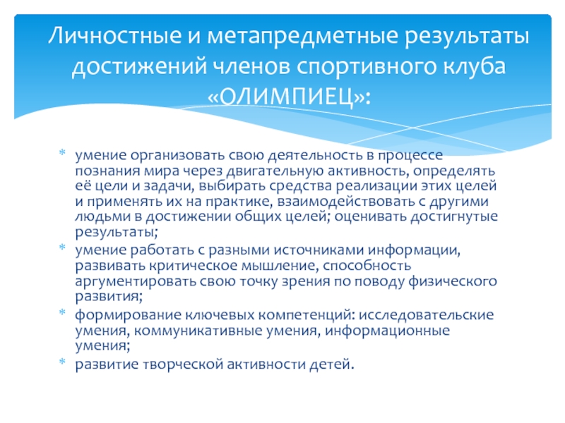Личностные и метапредметные результаты достижений членов спортивного клуба «ОЛИМПИЕЦ»: