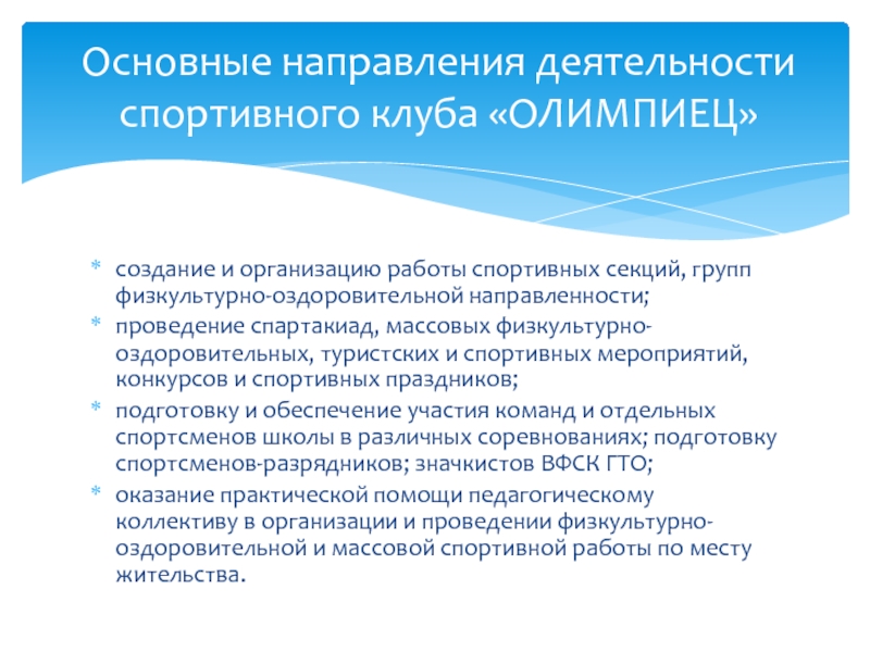 Основные направления деятельности спортивного клуба «ОЛИМПИЕЦ»