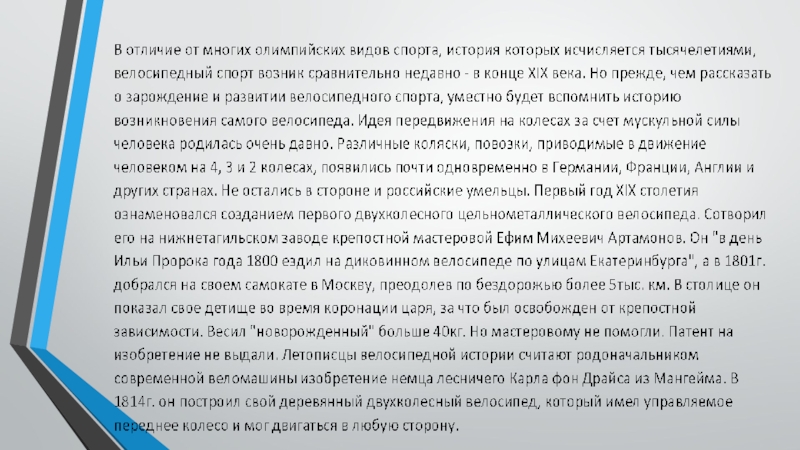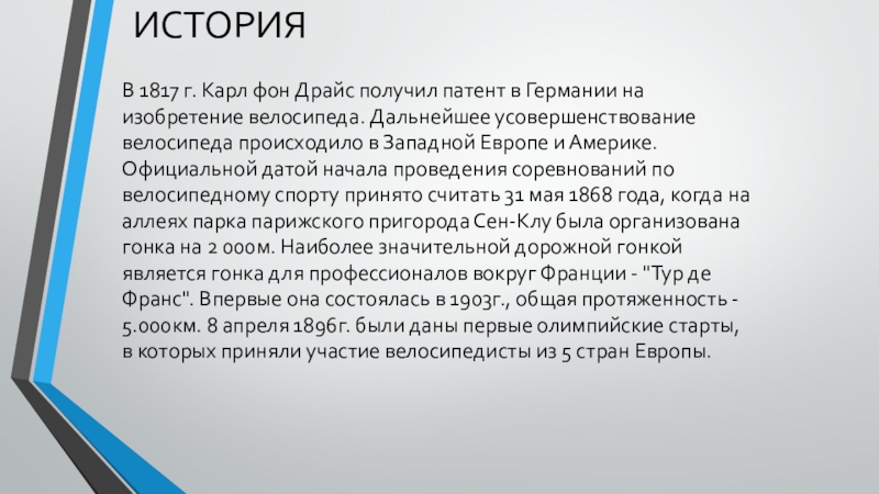 изобретение велосипеда. Дальнейшее усовершенствование велосипеда происходило в Западной Европе и Америке. Официальной датой начала проведения соревнований по велосипедному спорту принято считать 31 мая 1868 года, когда на аллеях парка парижского пригорода Сен-Клу была организована гонка на 2 000м. Наиболее значительной дорожной гонкой является гонка для профессионалов вокруг Франции - "Тур де Франс". Впервые она состоялась в 1903г., общая протяженность - 5.000км. 8 апреля 1896г. были даны первые олимпийские старты, в которых приняли участие велосипедисты из 5 стран Европы.