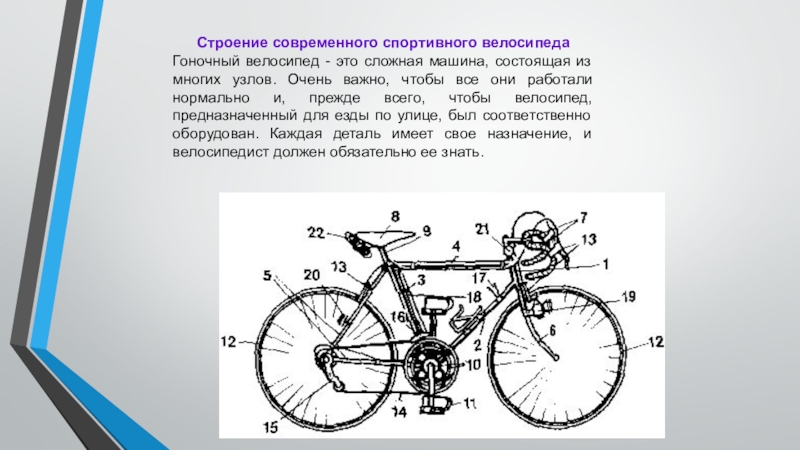 многих узлов. Очень важно, чтобы все они работали нормально и, прежде всего, чтобы велосипед, предназначенный для езды по улице, был соответственно оборудован. Каждая деталь имеет свое назначение, и велосипедист должен обязательно ее знать.