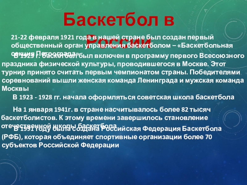 В 1923 - 1928 гг. начала оформляться советская школа баскетбола