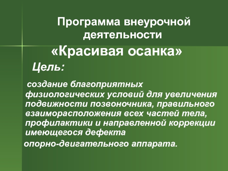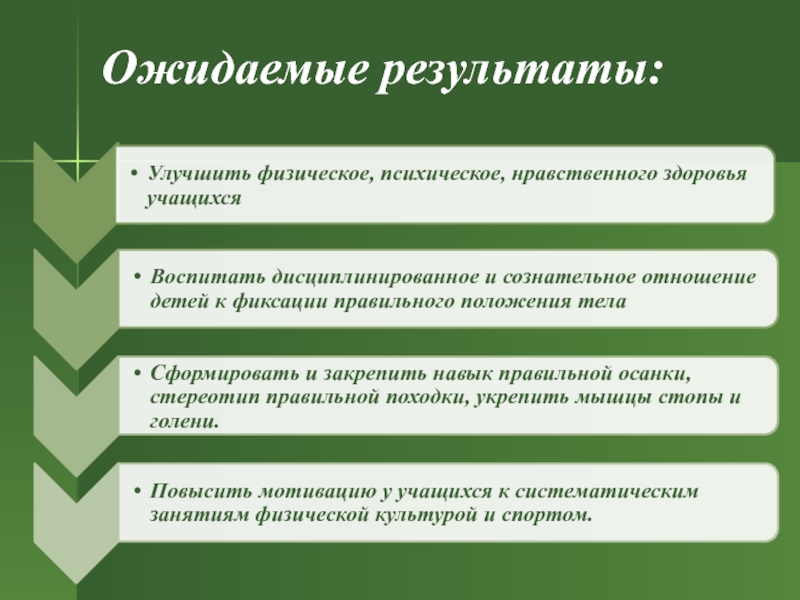 организация физического воспитания обучающихся таким образом, чтобы оно обеспечивало каждому ребенку гармоничное развитие, помогало ему использовать резервы своего организма для сохранения, укрепления здоровья и повышение его уровня, в том числе формирования правильной осанки и свода стопы.