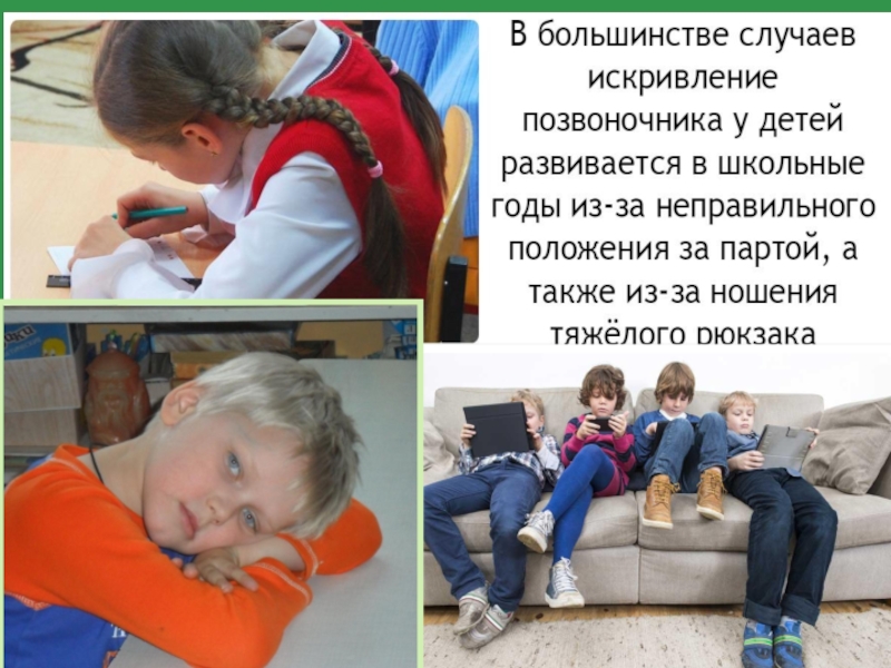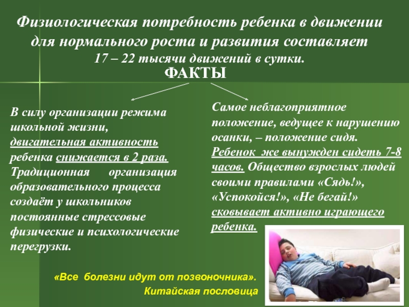 Самое неблагоприятное положение, ведущее к нарушению осанки, – положение сидя. Ребенок же вынужден сидеть 7-8 часов. Общество взрослых людей своими правилами «Сядь!», «Успокойся!», «Не бегай!» сковывает активно играющего ребенка.