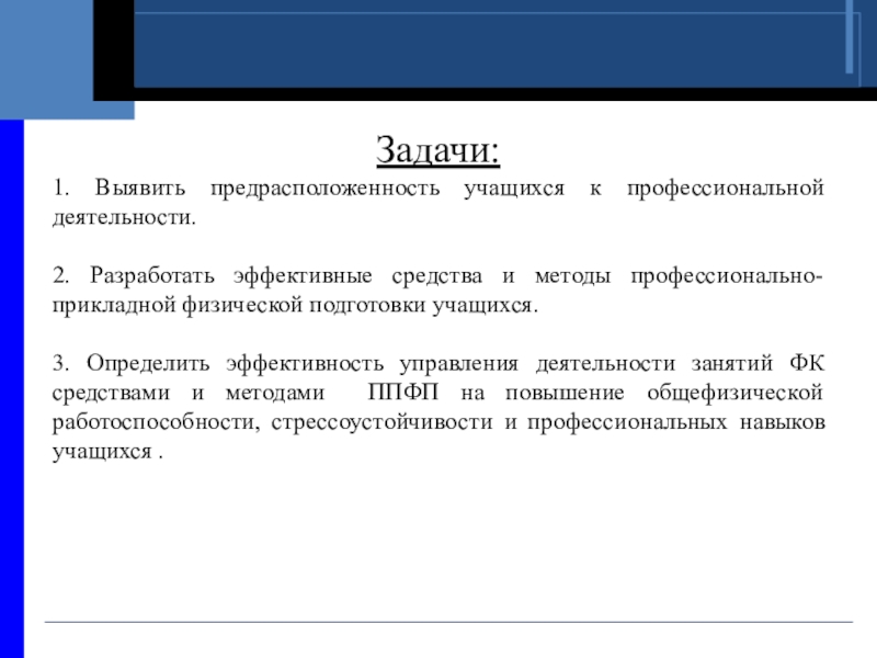 3. Определить эффективность управления деятельности занятий ФК средствами и методами ППФП на повышение общефизической работоспособности, стрессоустойчивости и профессиональных навыков учащихся .