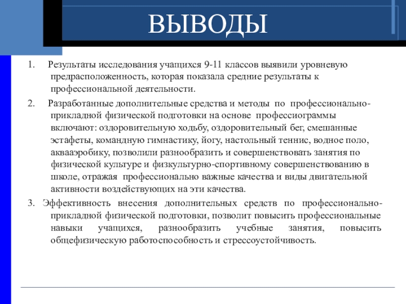 2. Разработанные дополнительные средства и методы по профессионально-прикладной физической подготовки на основе профессиограммы включают: оздоровительную ходьбу, оздоровительный бег, смешанные эстафеты, командную гимнастику, йогу, настольный теннис, водное поло, аквааэробику, позволили разнообразить и совершенствовать занятия по физической культуре и физкультурно-спортивному совершенствованию в школе, отражая профессионально важные качества и виды двигательной активности воздействующих на эти качества.