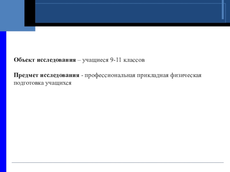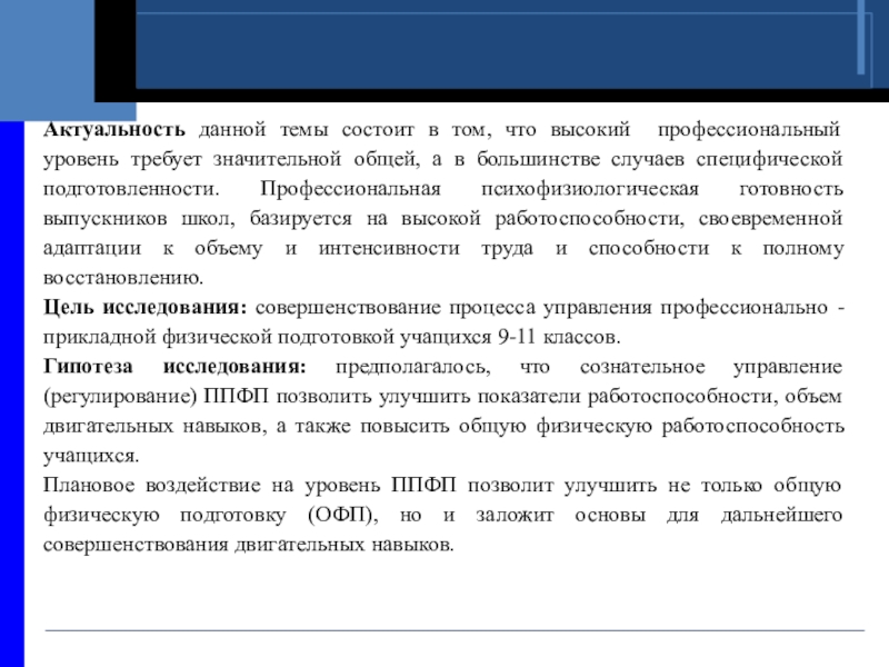 Цель исследования: совершенствование процесса управления профессионально - прикладной физической подготовкой учащихся 9-11 классов.