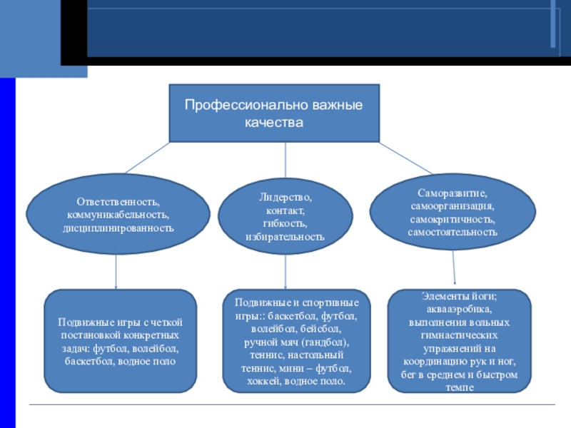 Подвижные и спортивные игры:: баскетбол, футбол, волейбол, бейсбол, ручной мяч (гандбол), теннис, настольный теннис, мини – футбол, хоккей, водное поло.