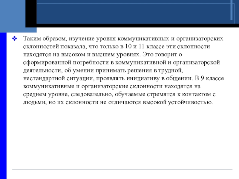 Слайд 11Таким образом, изучение уровня коммуникативных и организаторских склонностей показала, что только