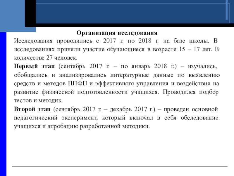 Первый этап (сентябрь 2017 г. – по январь 2018 г.) – изучались, обобщались и анализировались литературные данные по выявлению средств и методов ППФП и эффективного управления и воздействия на развитие физической подготовленности учащихся. Проводился подбор тестов и методик.