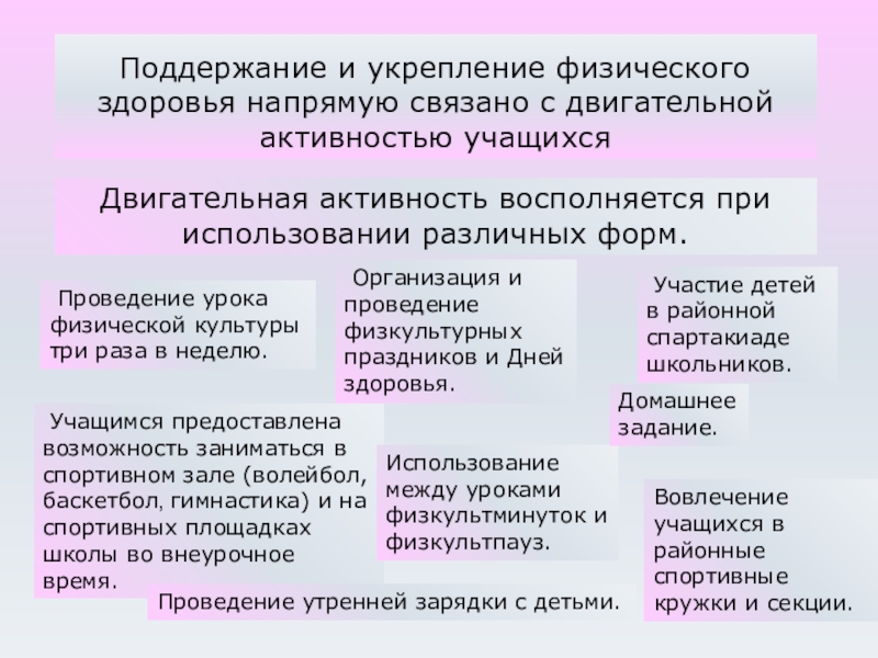 Учащимся предоставлена возможность заниматься в спортивном зале (волейбол, баскетбол, гимнастика) и на спортивных площадках школы во внеурочное время.