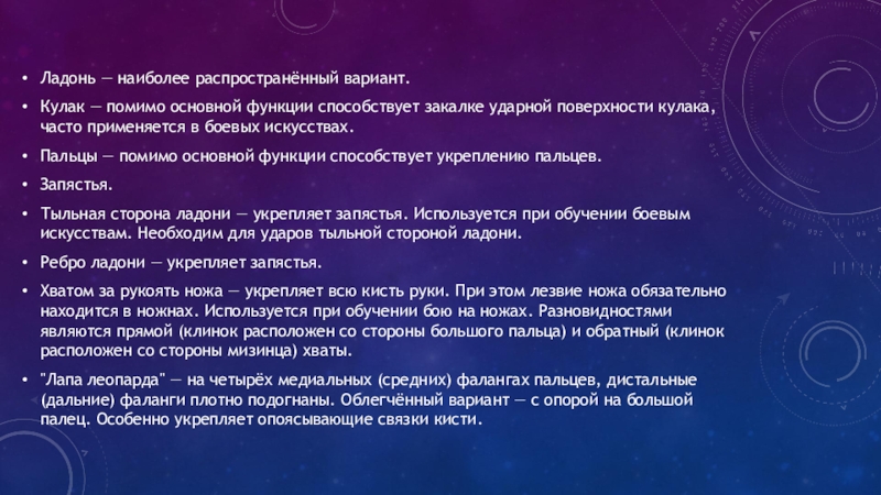 Тыльная сторона ладони — укрепляет запястья. Используется при обучении боевым искусствам. Необходим для ударов тыльной стороной ладони.