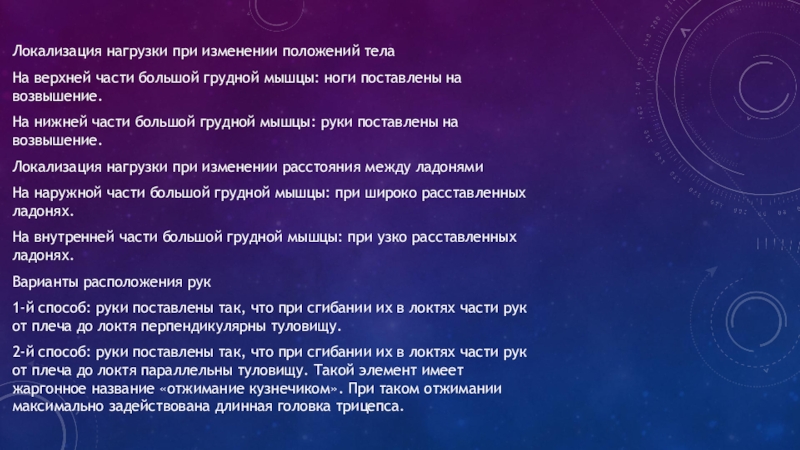 Локализация нагрузки при изменении положений телаНа верхней части большой грудной мышцы: ноги поставлены на возвышение.На нижней части