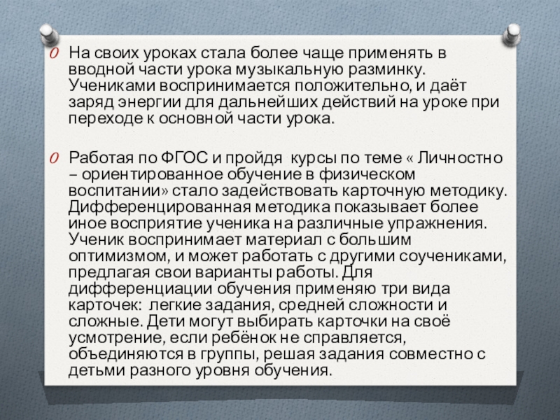 Работая по ФГОС и пройдя курсы по теме « Личностно – ориентированное обучение в физическом воспитании» стало задействовать карточную методику. Дифференцированная методика показывает более иное восприятие ученика на различные упражнения. Ученик воспринимает материал с большим оптимизмом, и может работать с другими соучениками, предлагая свои варианты работы. Для дифференциации обучения применяю три вида карточек: легкие задания, средней сложности и сложные. Дети могут выбирать карточки на своё усмотрение, если ребёнок не справляется, объединяются в группы, решая задания совместно с детьми разного уровня обучения.