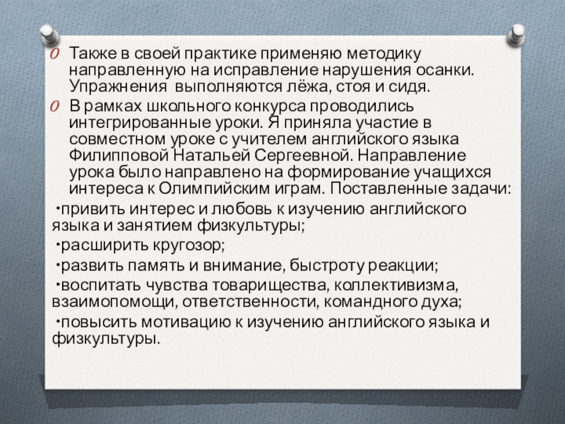 Слайд 11Также в своей практике применяю методику направленную на исправление нарушения осанки.