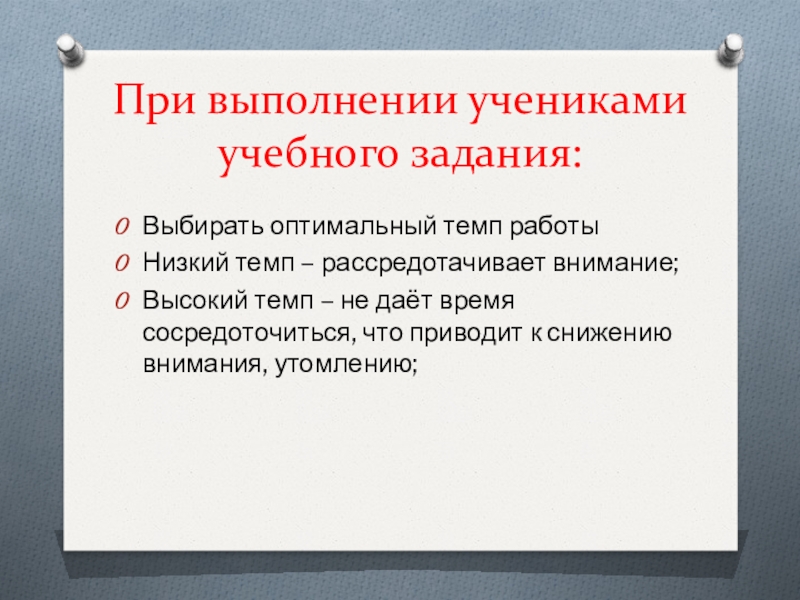 Высокий темп – не даёт время сосредоточиться, что приводит к снижению внимания, утомлению;
