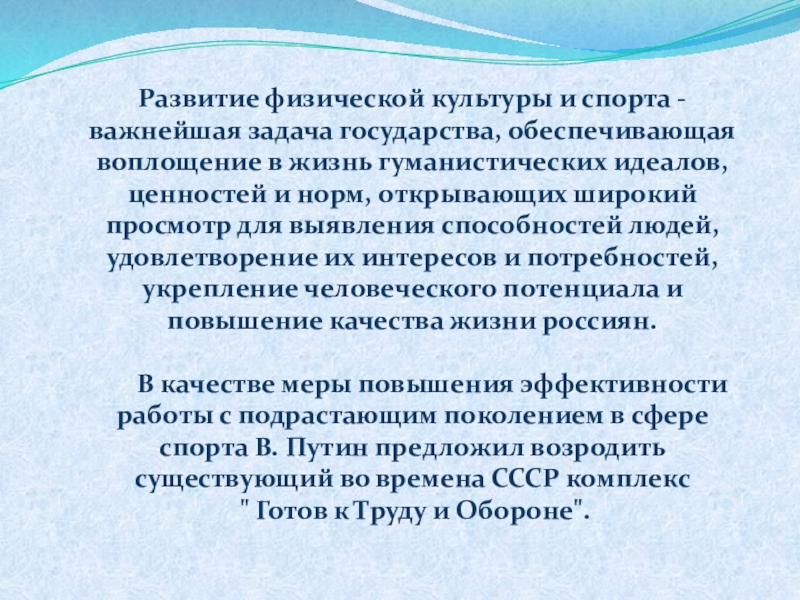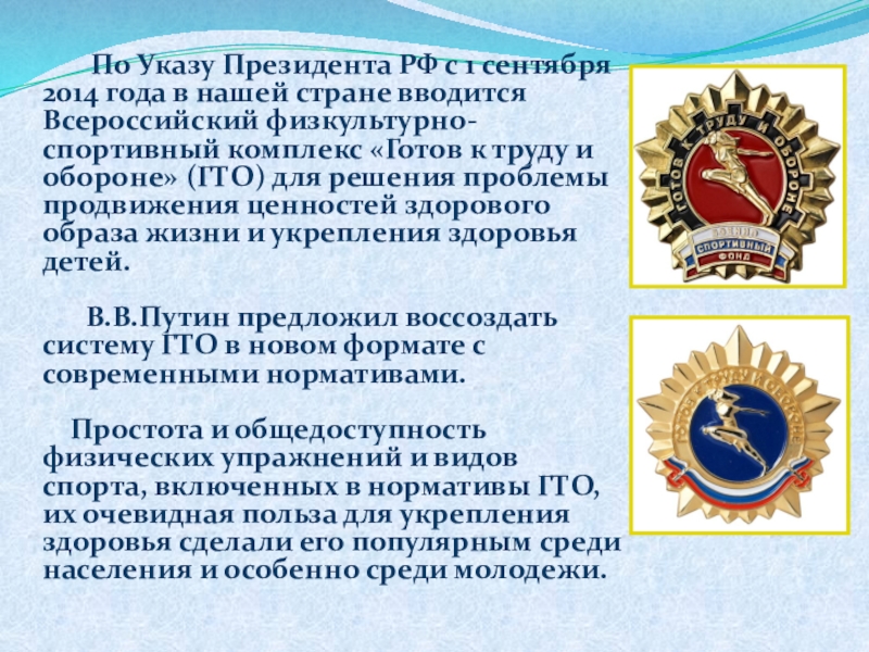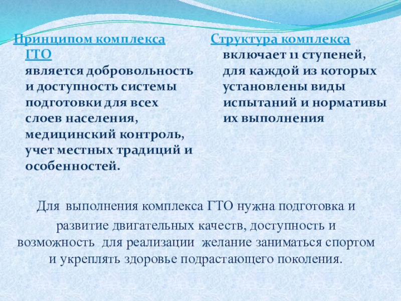 Принципом комплекса ГТО является добровольность и доступность системы подготовки для всех слоев населения, медицинский контроль, учет местных традиций и особенностей.